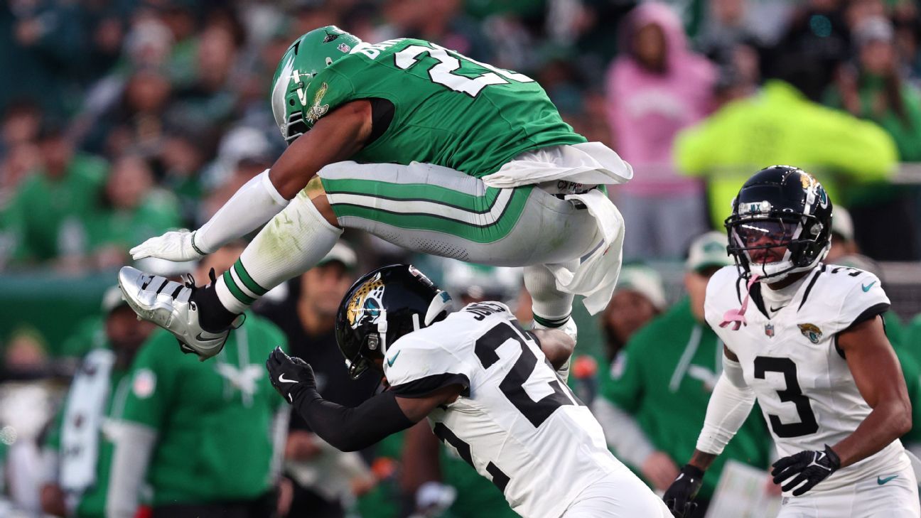 El corredor de los Eagles logró un asombroso obstáculo inverso en la victoria del 28-23 de Filadelfia sobre los Jacksonville Jaguars el 3 de noviembre. En el segundo cuarto, se escindió una captura, saltó sobre DB Jarrian Jones e instantáneamente creó un punto destacado de un destacado -La contendiente al año. EA Sports no perdió el tiempo, agregando el movimiento a Madden 25 en una actualización del 20 de noviembre.